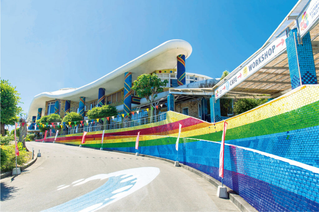 カラフルなガラス作品や白いテラス、青い海と空のコントラストは、SNS映え間違いなし。